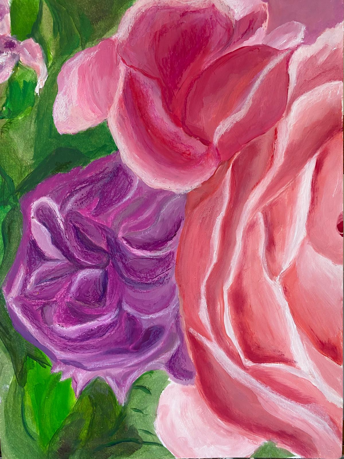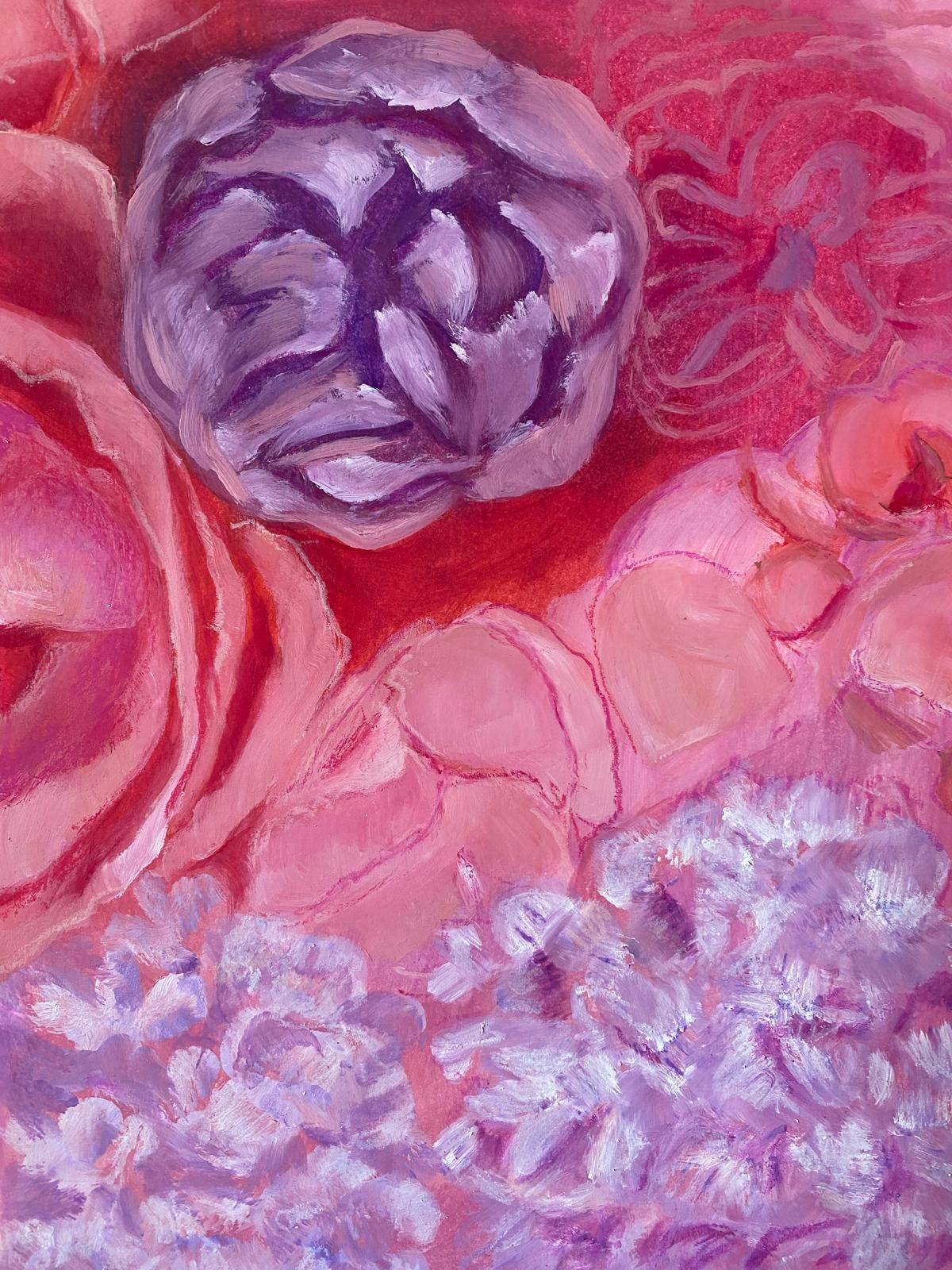 Bu eser, Nevin Yıldız’ın doğaya duyduğu derin bağlılığı ve renklerle kurduğu sezgisel ilişkiyi güçlü bir biçimde yansıtır. Pembe ve kırmızının sıcak zemininde beliren mor ve lila tonları, izleyiciyi hem duygusal hem de içsel bir yolculuğa davet eder. Çiçek formlarını çağrıştıran organik şekiller, doğanın canlılığını ve sürekliliğini simgelerken, katmanlı fırça darbeleri esere ritmik bir hareket kazandırır.